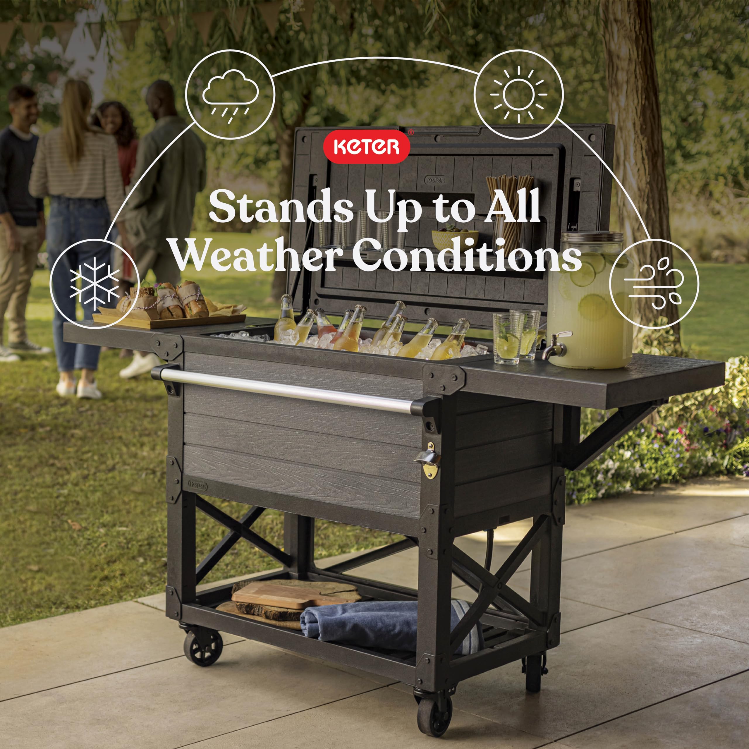 Keter 89.8 Qt Portable Outdoor Patio Cooling Chest, Ice Chest Beverage Party Bar Cart Table with Swivel Wheels, Shelves, and Bottle Opener, Graphite