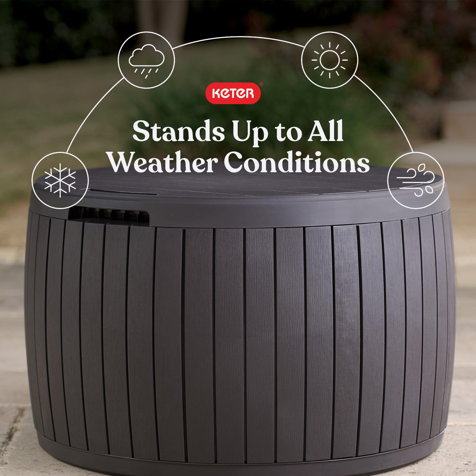Keter Circa 37 Gallon Deck Box Organizer, Works as Ottoman Chair or Side Table, Brown – Large Resin Round Outdoor Storage and Seating for Garden, Pool, and Patio—