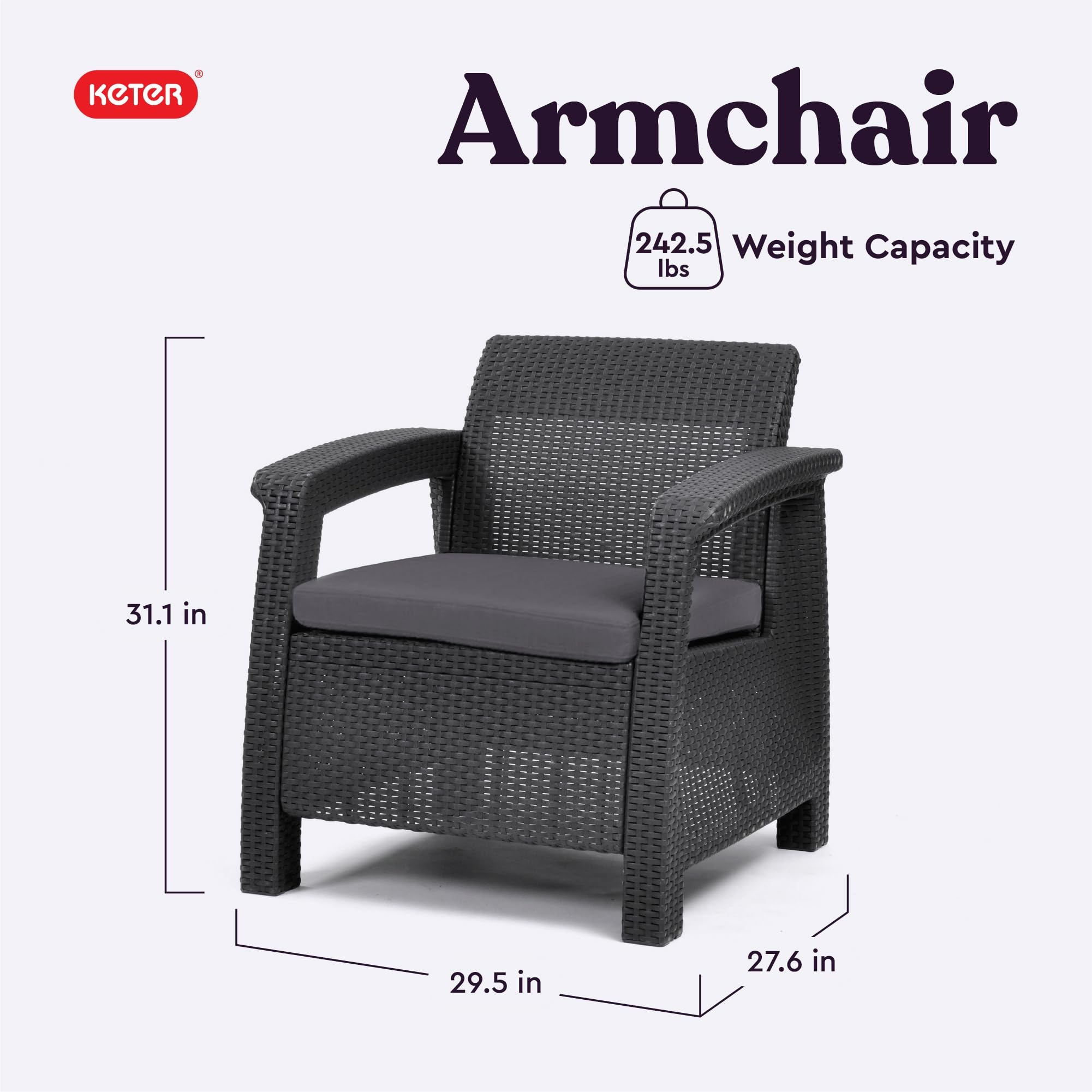 Keter Corfu 4 Piece Set All Weather Outdoor Patio Garden Furniture with Cushions, Charcoal—