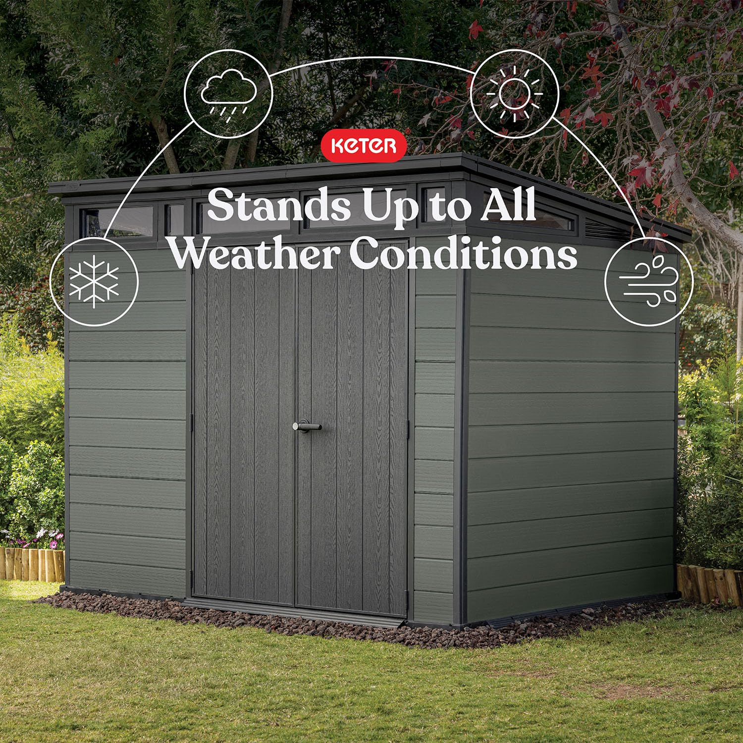 Keter Cortina 9x7 ft Outdoor Storage Shed with All‑Weather Wood‑Look Panels, Skylight, Window, Steel Reinforcement & Lockable Double Doors, Green
