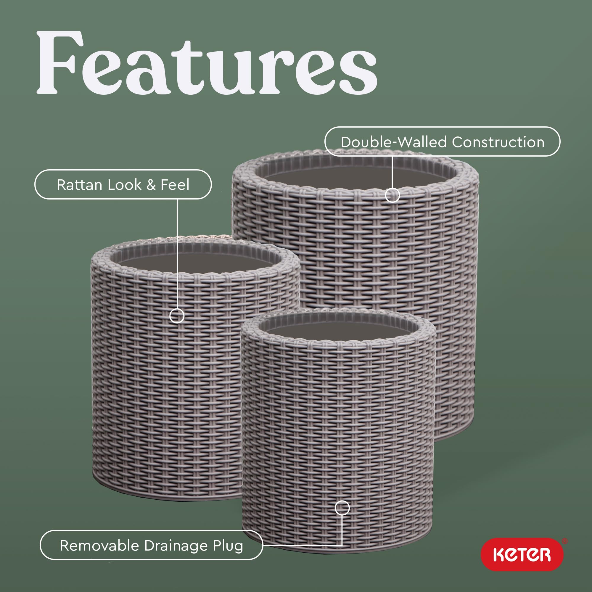 Keter Cylinder Set of 3 Rattan Resin Planter for Indoor and Outdoor Plants Ideal Decorative Planter for Porches and Patio Decor, Taupe
