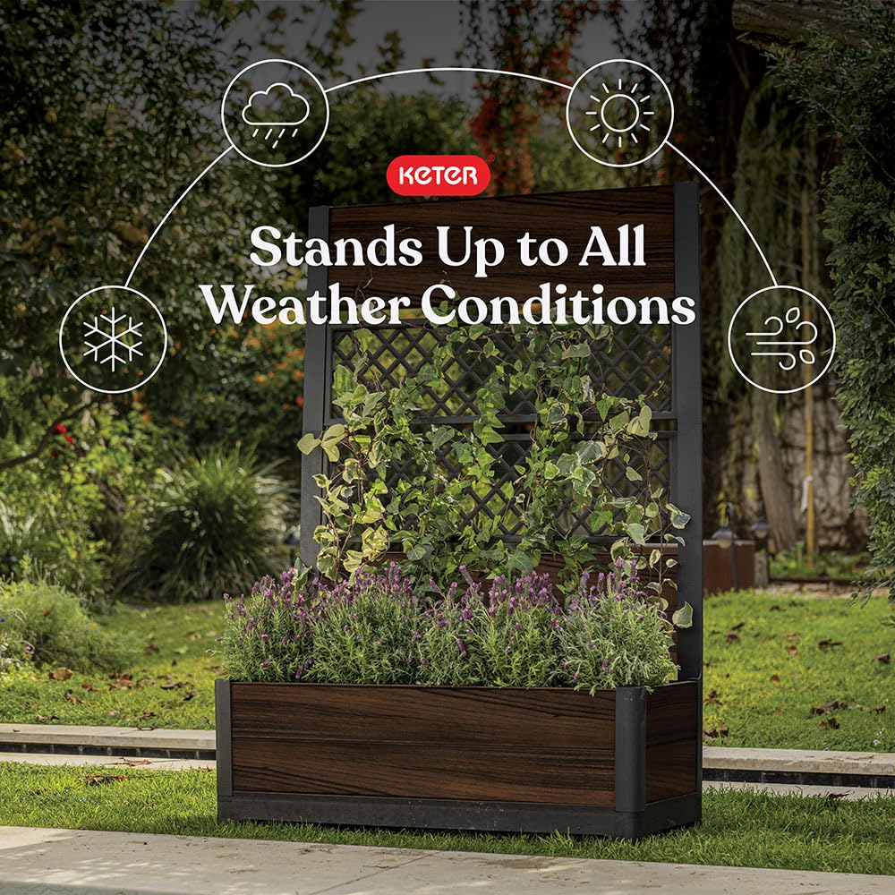 Keter Outdoor Planter Box with Privacy Screen and Trellis – 26 Gallon Raised Garden Bed for Climbing Plants & Flowers – Wood-Look Resin, Weather-Resistant Divider for Patio, Balcony & Backyard