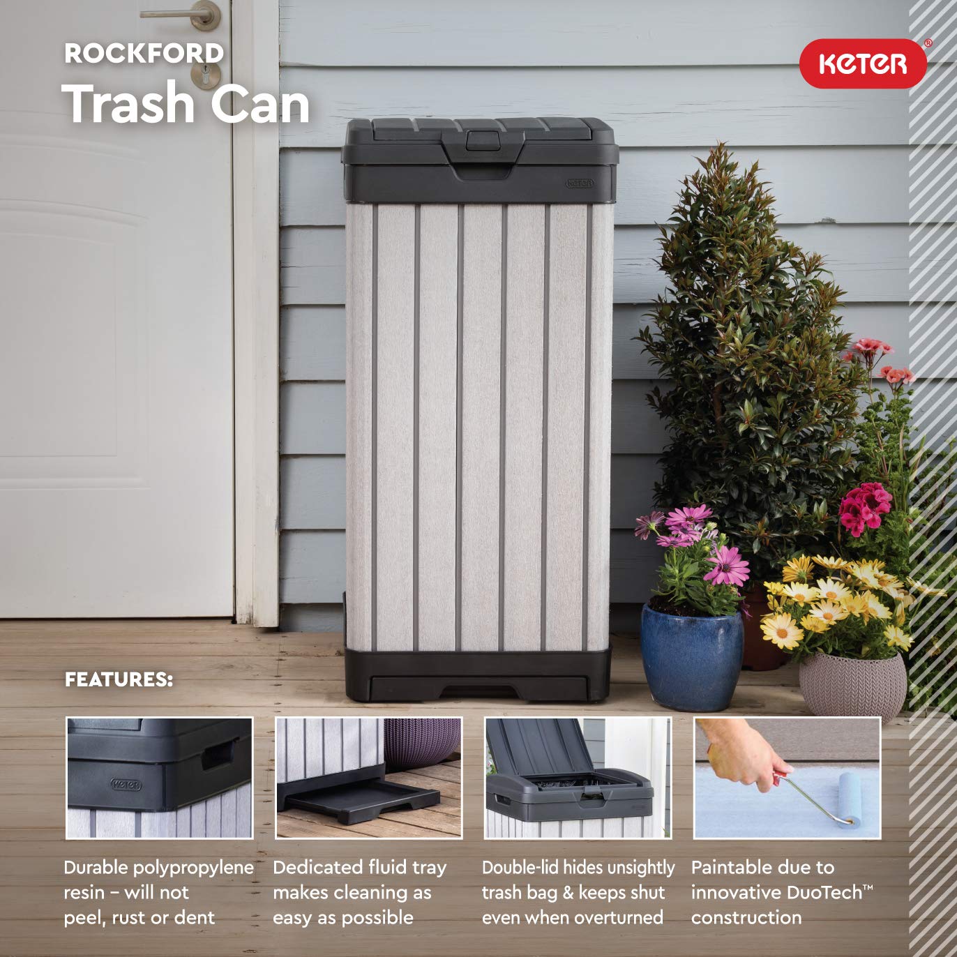 Keter Rockford Resin 38 Gallon Outdoor Kitchen Trash Can with Lid and Drip Tray for Easy Cleaning-Perfect for Patio Dining, Grey—