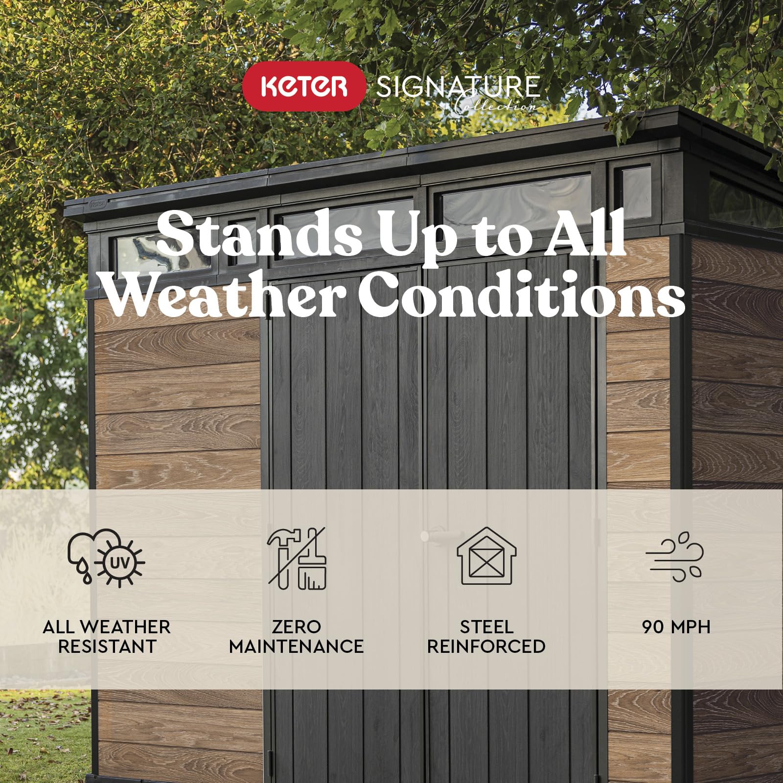 Keter Signature Collection 9x7 Ft All-Weather Storage Shed with Skylight, Window, Built-in Ventilation, & Lockable Double Doors, Walnut